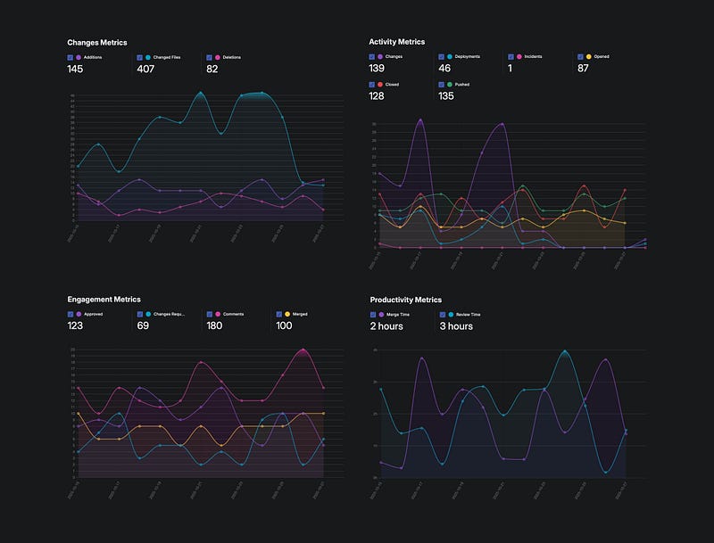 Plus broader engineering metrics: merge times, PR activity, code change patterns.